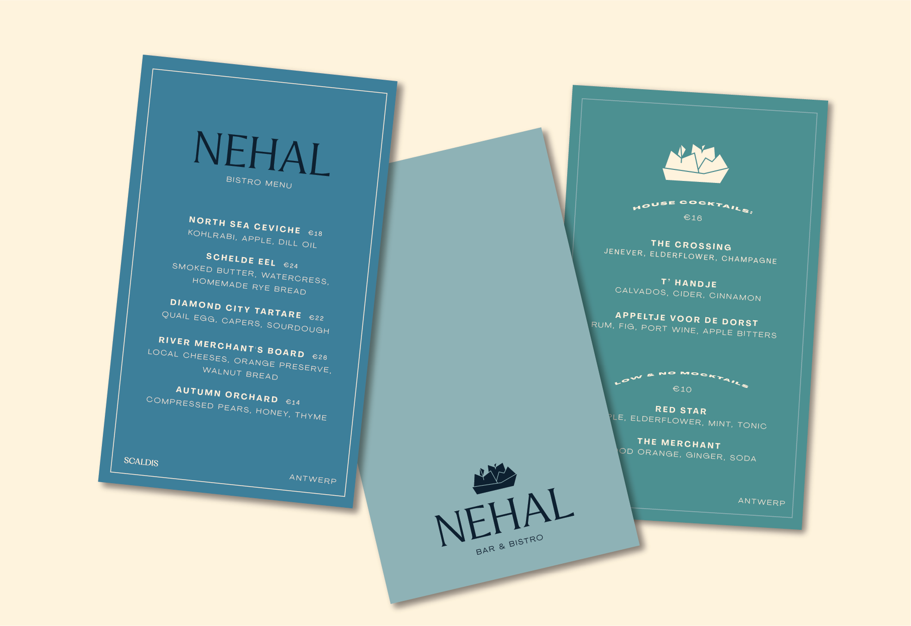 The name comes from the Latin word for the Schelde. The brand draws on the mythology of Nehalennia, the ancient goddess who protected travellers crossing the North Sea. Her symbols (ships, fruit, abundance) are woven into the visual identity without ever feeling like a history lesson.